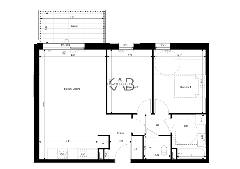 Découvrez cet appartement 3 pièces d'une superficie de 63.27m2 qui se compose : d'une entrée avec placard intégré, une pièce de vie de 26m2 avec cuisine ouverte à équiper bénéficiant d'un accès vers un balcon de 7m2, un dégagement nuit, un WC indépendant, deux chambres de 11.92m2 et 10.29m2, une salle de bains dotée d'une baignoire et d'un meuble vasque en céramique.
