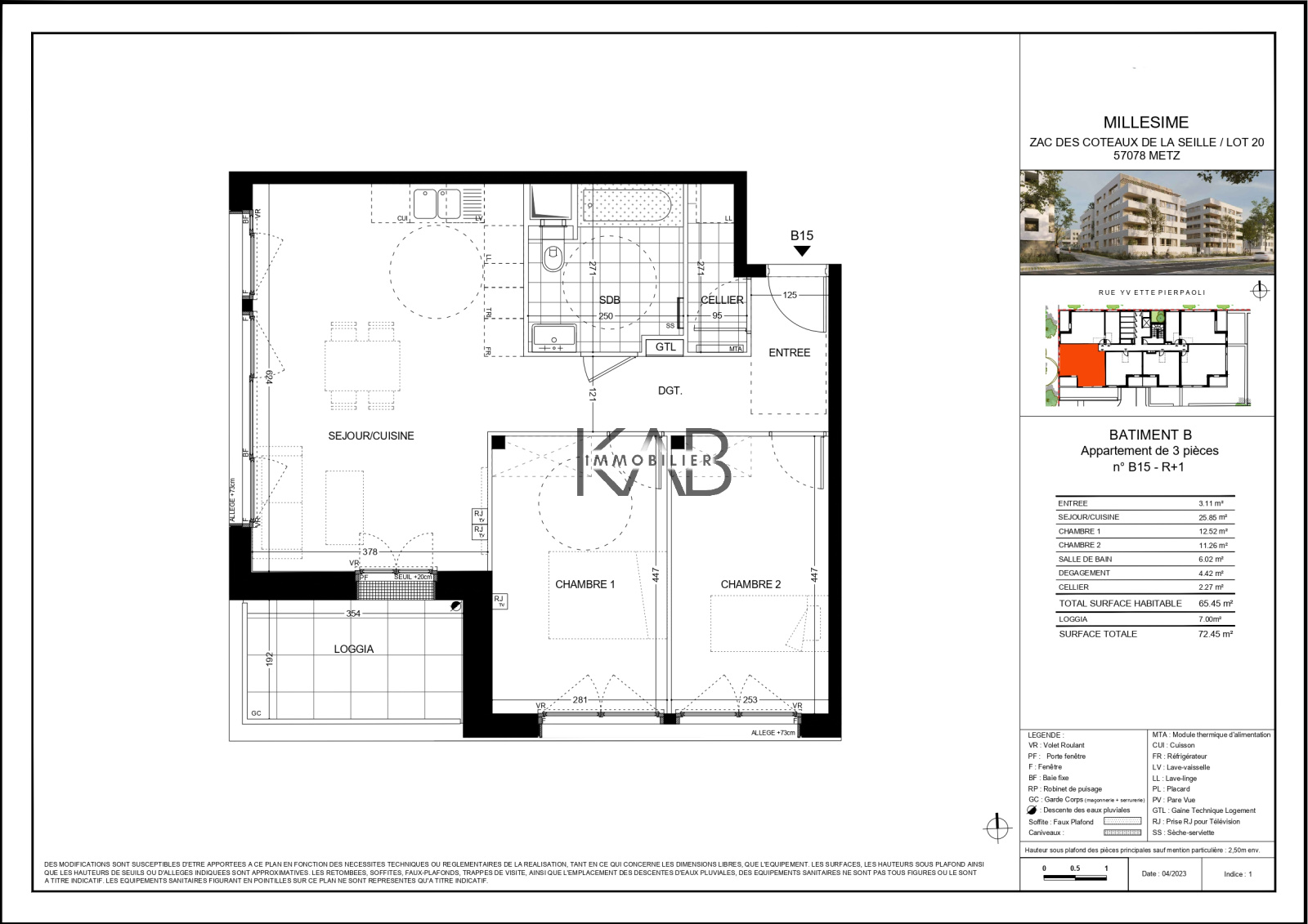 Découvez cet appartement de type F3 de 65.45 m2 comprenant une entrée, une pièce à vivre salon-séjour avec cuisine ouverte de 25.85 m2 donnant accès directement sur la loggia de 7m2 exposé plein sud, une salle de bains avec wc et un cellier.
