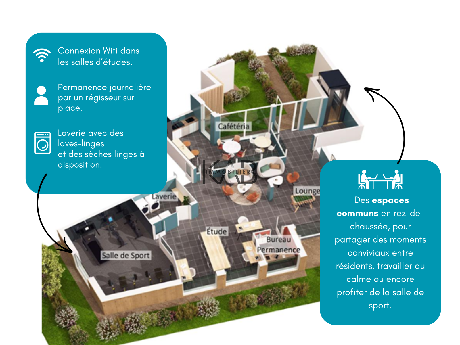 Les résidents profiteront d'une vie en communauté avec des espaces communs : une laverie, salles d'études, une salle de sport et une cafétéria ainsi qu'un patio extérieur aménagé !
