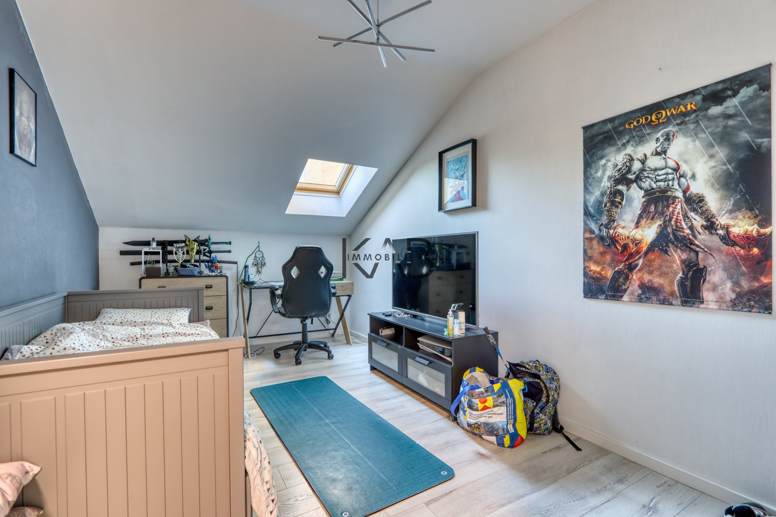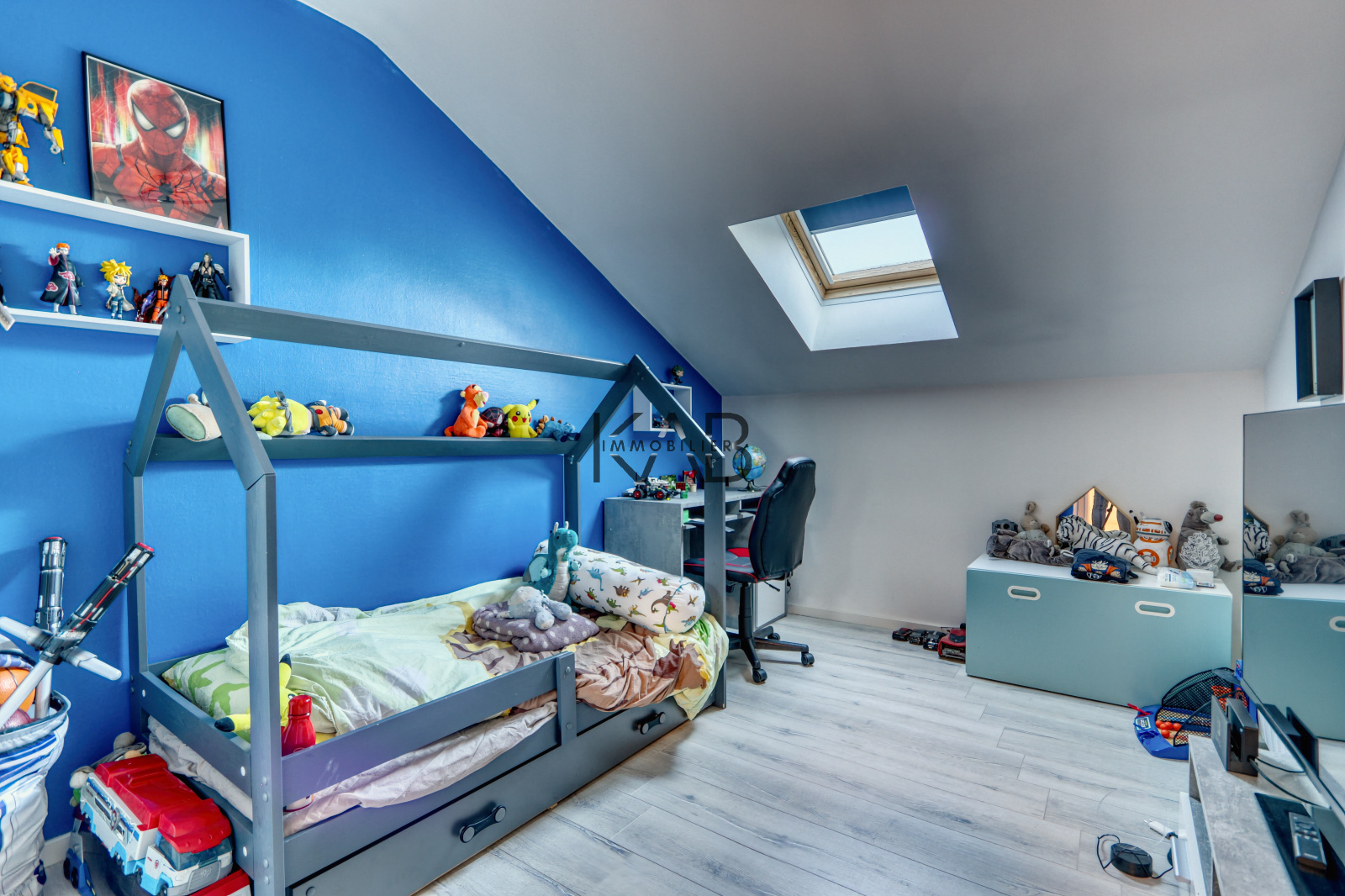 À l'étage, deux chambres confortables de 9m2 et 11m2, un dégagement nuit, une grande chambre parentale de 18m2 avec placards de rangement, et une spacieuse salle de bains dotée d'une baignoire d'angle, d'une douche à l'italienne, un meuble double vasque et un WC.